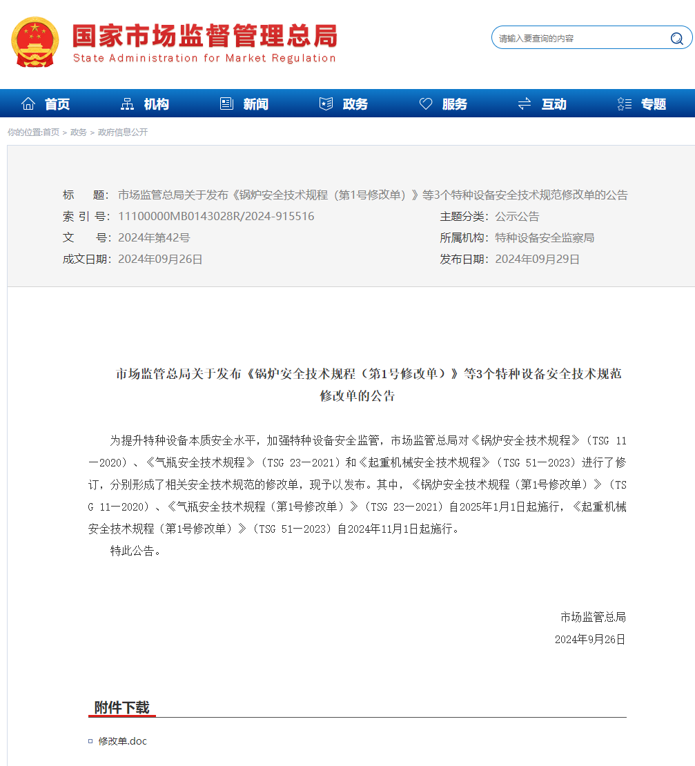 市场监管总局关于发布《锅炉安全技术规程(第1号修改单)》等3个特种设备安全技术规范修改单的公告。