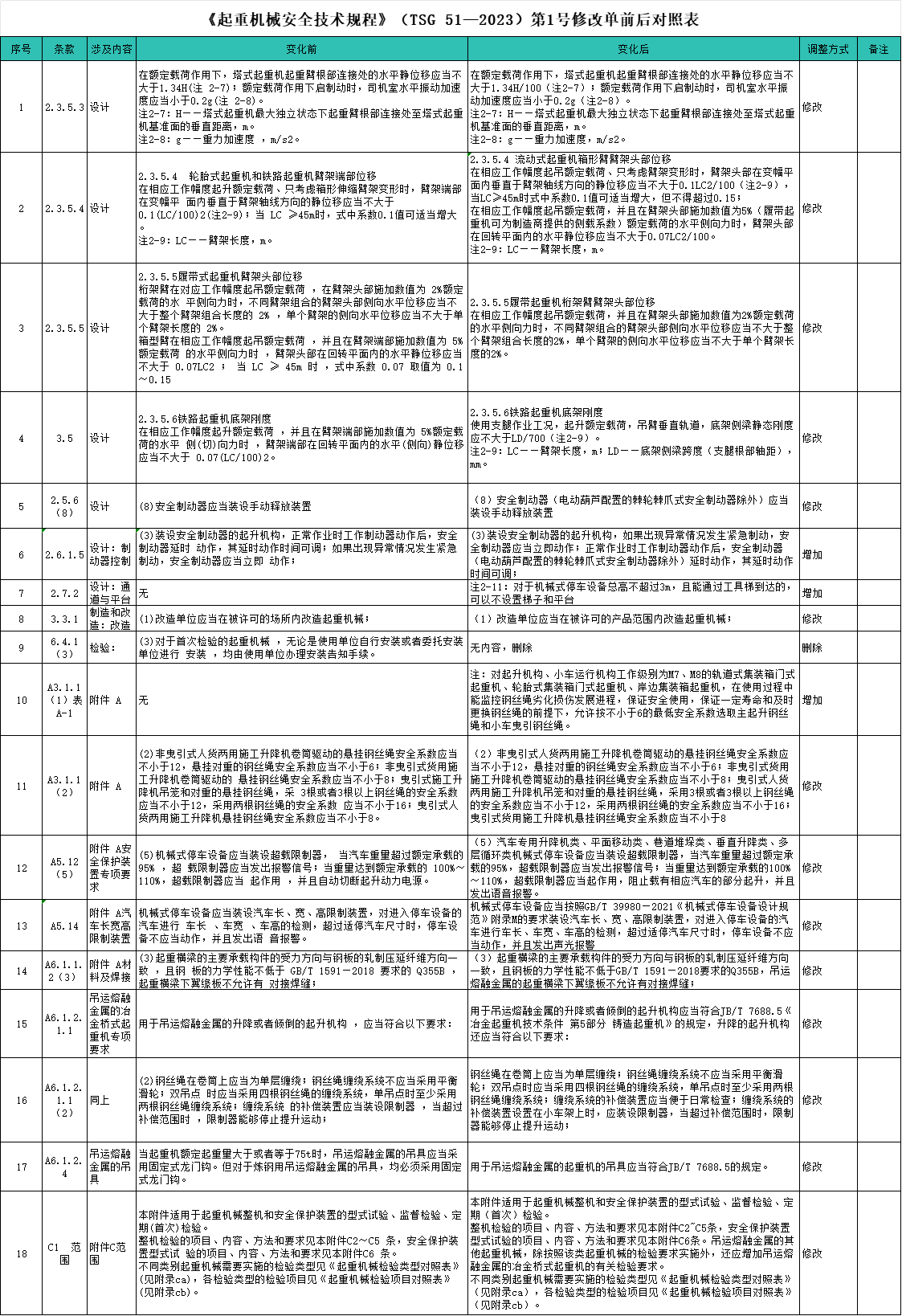现将《起重机械安全技术规程》(TSG 51—2023)第1号修改单前后条款做一一对比列表,以作直观对比使用。