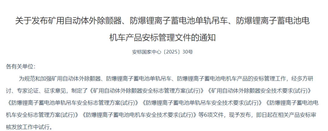 近日,安标国家矿用产品安全标志中心修订了《矿用自动体外除颤器安全标志管理方案(试行)》、《矿用自动体外除颤器安全技术要求(试行)》、《防爆锂离子蓄电池单轨吊车安全标志管理方案(试行)》、《防爆锂离子蓄电池单轨吊车安全技术要求(试行)》、《防爆锂离子蓄电池电机车安全标志管理方案(试行)》、《防爆锂离子蓄电池电机车安全技术要求(试行)》等6项文件,即日起在相关产品安标审核发放工作中试行。