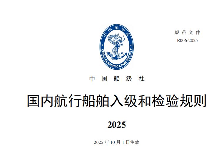 中国船级社国内航行船舶入级和检验规则2025,即将于2025 年10月1日开始生效,该新规明确了国内航行船舶的入级范围、条件;建造前、中、后各阶段的检验规则,规范了检验采用的依据、方法、项目、流程等内容。
