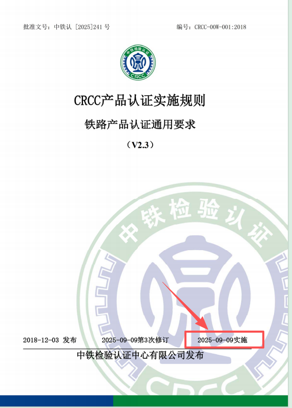 CRCC产品认证实施规则《铁路产品认证通用要求》已于2025年9月9日修订为V2.3版,即日起实施。