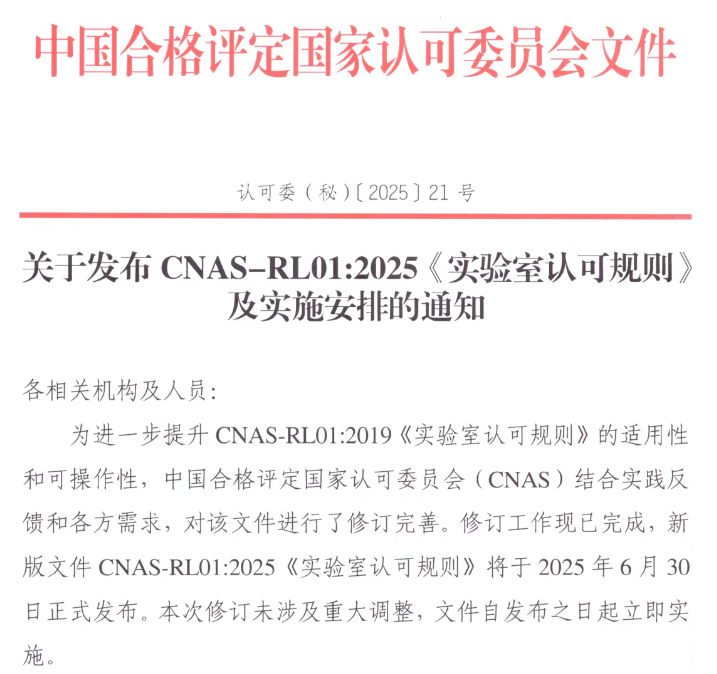 CNAS-RL01:2025《实验室认可规则》正式实施