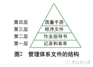 文件编写小组按ISO/IEC 17025:2005要求编制文件。文件层次一般分为四层:质量手册,程序文件,作业指导书,操作规程,记录和表单(见图2)。