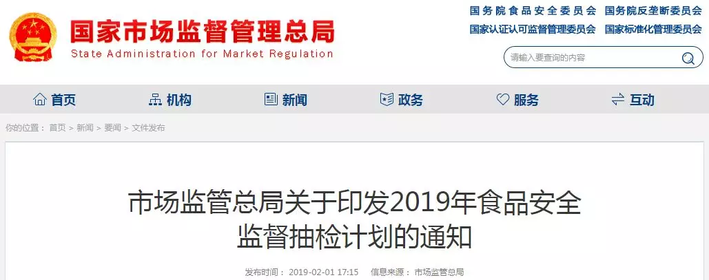 市场监管总局官网发布关于印发2019年食品安全监督抽检计划的通知。根据计划,2019年食品安全抽检计划涵盖34个食品大类、150个食品品种、259个食品细类,共抽检133.96万批次。具体内容如下:
